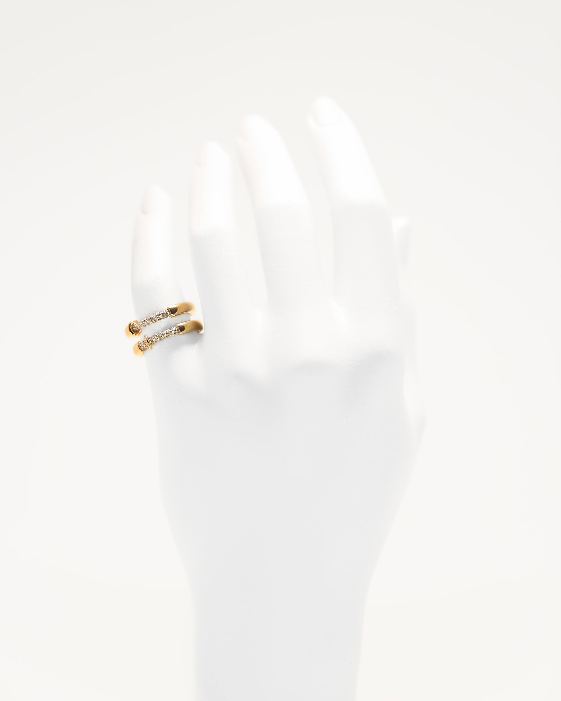 A sculptural double-band silhouette is illuminated with VS diamonds, lab-grown, while two movable gold end caps introduce subtle kinetic movement—precision calibrated for tension and restraint.