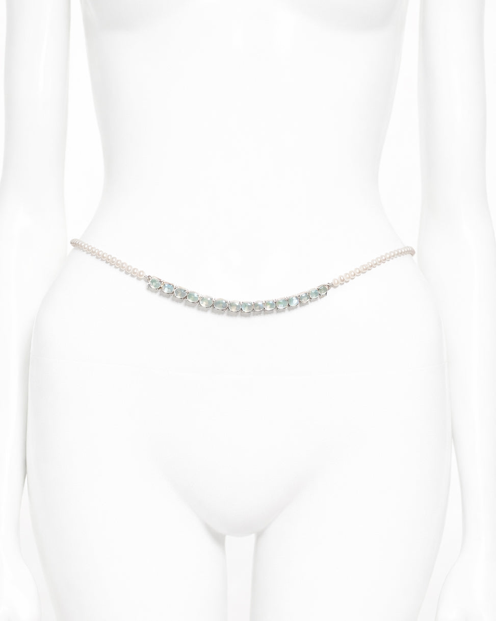 The Varuna Chain is a luminous expression of fluid elegance and modern refinement. Crafted with lustrous shell pearls that trace the body with effortless grace, this piece transitions seamlessly between a waist chain and a layered wrap bracelet. A front detail of bezel-set rainbow moonstones lends an ethereal glow—each stone shifting softly with iridescent light, symbolizing clarity, intuition, and new beginnings.